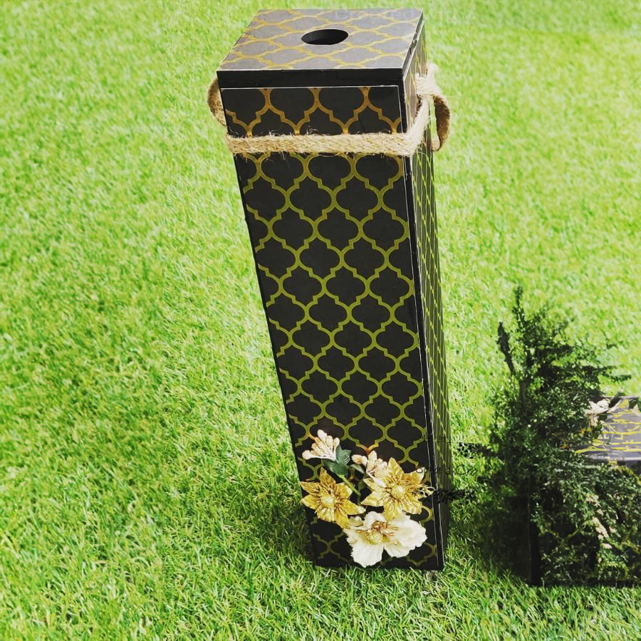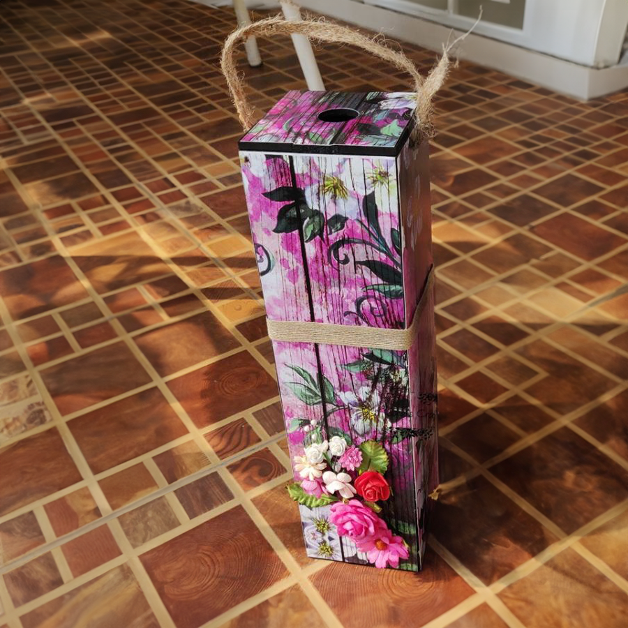 The wine bottle gift box is made of wood and decorated in specialized paper/print. It can accomodate a 750 ml wine bottle (the boxes are customizable). The box becomes a great gift when you are gifting wine and is sturdy enough to safe-guard the wine bottle.