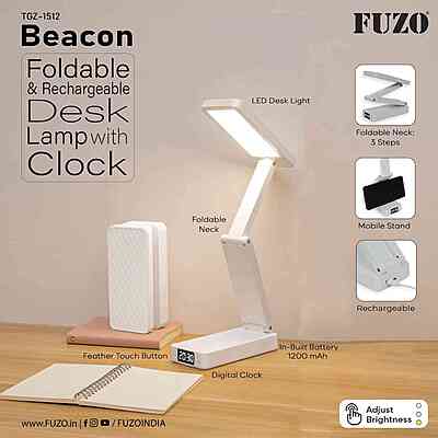 Your ultimate desk upgrade is here. The Fuzo Beacon is a foldable and rechargeable lamp that does it all. It has a digital clock, a mobile stand, and a sleek design that fits anywhere.