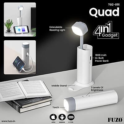 This isn't just a lamp—it's your new go-to gadget. Meet the Fuzo Quad, a 4-in-1 tool that's a lamp, power bank, mobile stand, and a torch. Keep your desk bright and your devices charged, wherever you are!