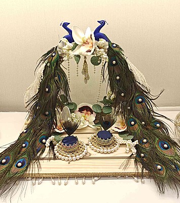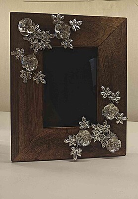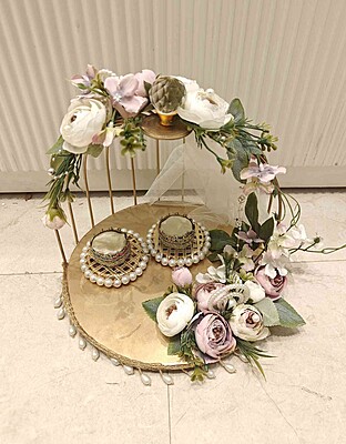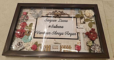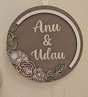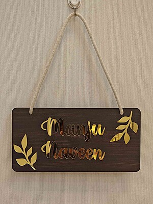 This circular nameplate made in wood looks great on your wall with the proportional pieces of wood (with grains) cut with precision. And contrasting color letters and decorated leaves are placed on the nameplate.