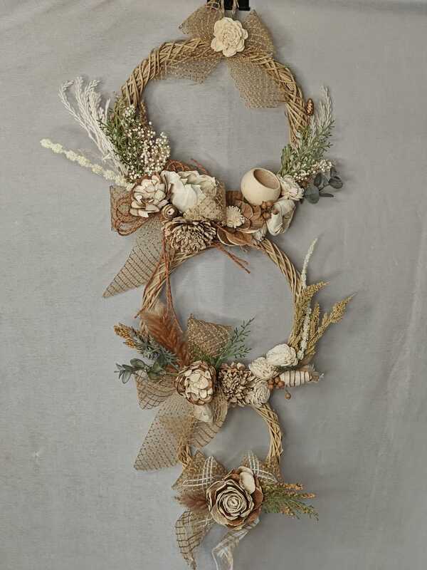 Triple Hoop Wall Hanging with Dried Florals & Neutral Mesh Ribbons