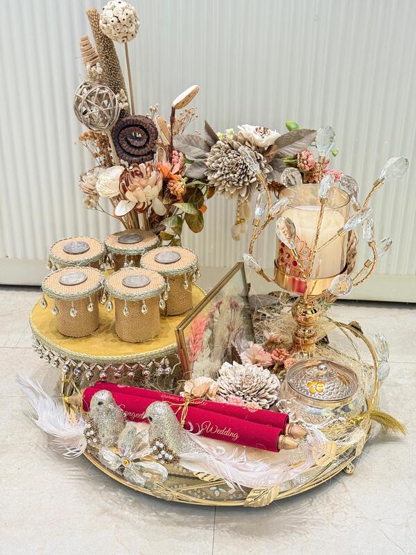Featuring a handcrafted floral arrangement, an elegant candle holder, designer sweet containers, and a personalized wedding scroll, this hamper blends tradition with modern sophistication. (excluded Silver Coin and Silver Jar)