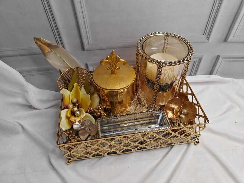 Luxury Decorative Golden Tray with Candle, Metallic Accents