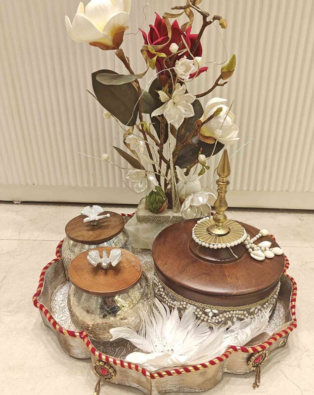 Beside it are two textured silver jars with wooden lids, each topped with delicate bird-shaped handles, contributing a refined and artistic touch. The entire setup is arranged on a beautifully crafted tray with gold accents, red detailing along the edges, and ornamental handles, enhancing its traditional charm.