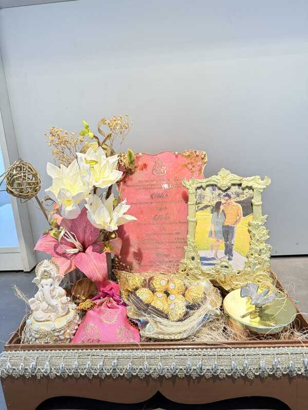 A beautifully curated wedding invitation hamper featuring a resin-made invitation card, an elegant photo frame, Ferrero Rocher chocolates, and a divine Ganesha idol. Thoughtfully arranged in a decorative tray with floral accents, this hamper is perfect for announcing your special day with grace and tradition.