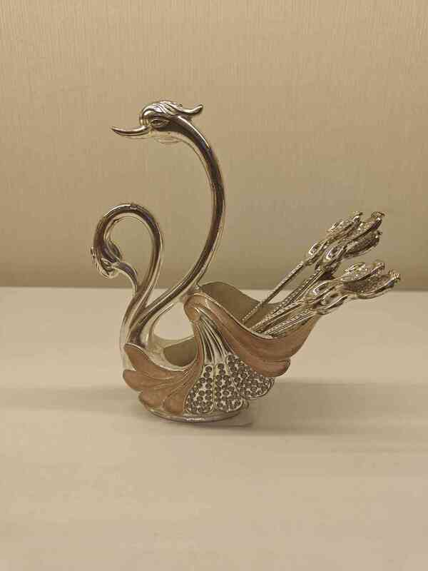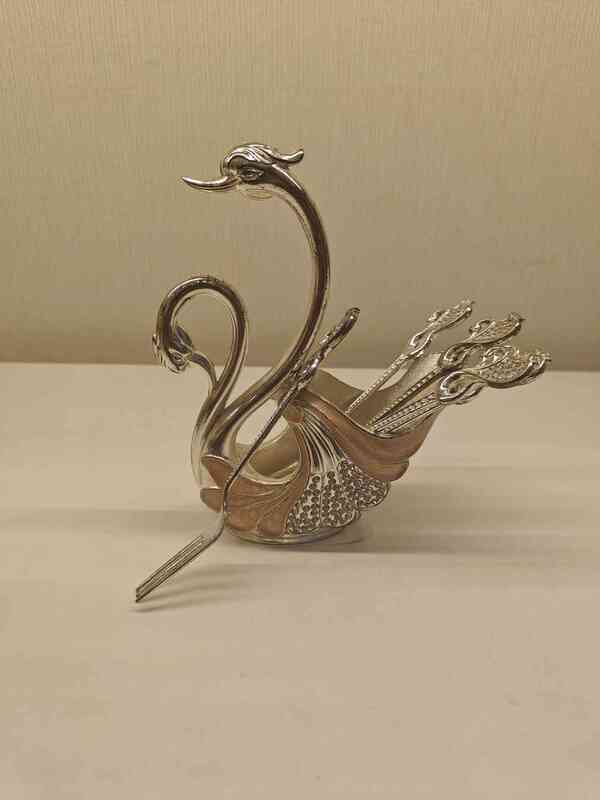This exquisite German silver spoon stand features two elegantly intertwined swans forming a holder for your spoons. Crafted with intricate detailing and a touch of sophistication, this piece adds a classic charm to any dining setup. Perfect for serving spoons or as a decorative piece on your dining table. Made from high-quality German silver, it promises durability and a timeless look.
