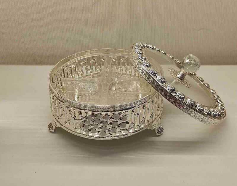 This elegant German silver dry fruits box features a beautiful Greek key pattern design on its body. The box is adorned with decorative elements on the rim and has three small ball feet for stability. Perfect for storing and serving dry fruits or other small treats, this box combines traditional craftsmanship with a touch of classic design.
